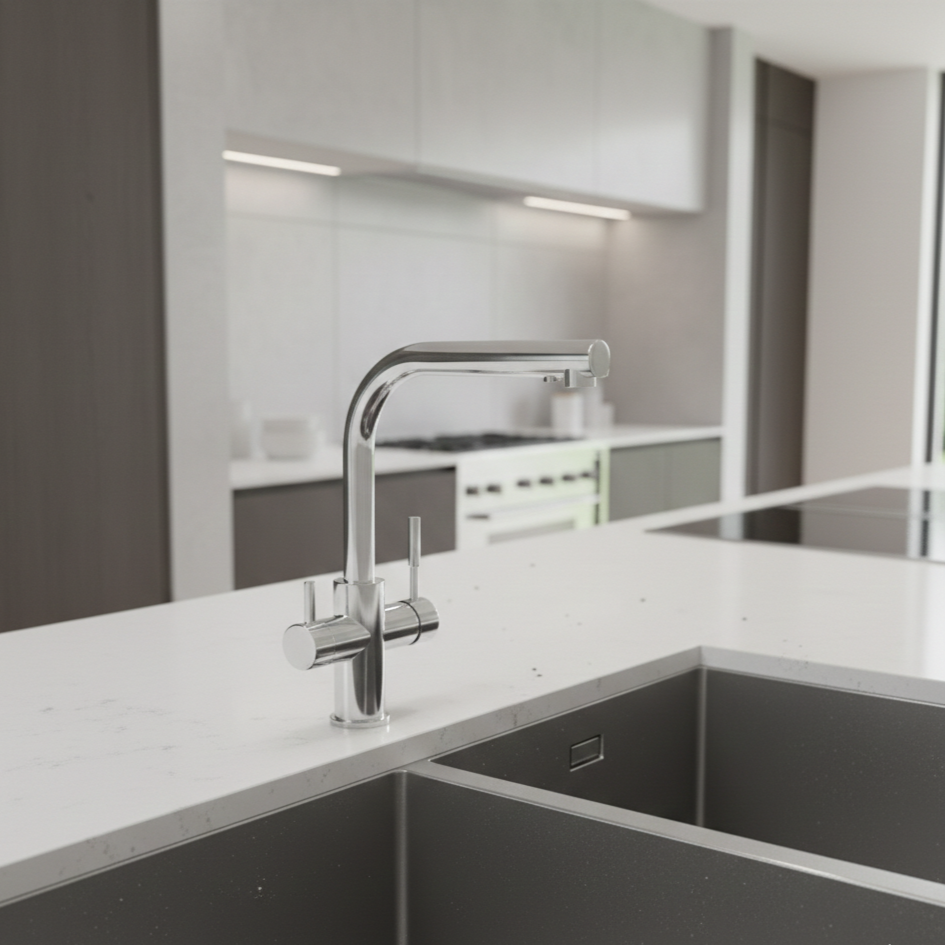 The Puretec Tripla-T3 Triple Action Mixer Tap combines hot, cold and filtered drinking water into one stylish, space-saving design perfect for modern Perth homes and kitchen renovations.